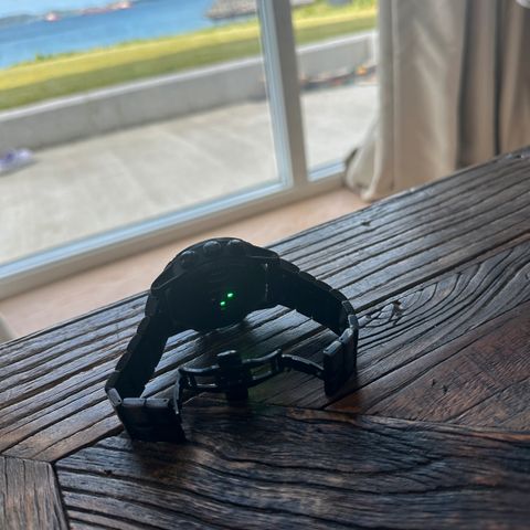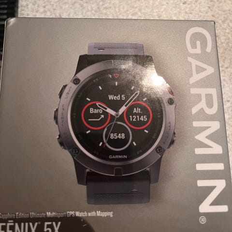 Garmin Fenix 5X GPS Smartklokke med svart rem og robust design. Klokken har GPS-funksjonalitet, pulsmåler på baksiden, og er laget for utendørsaktiviteter og trening.