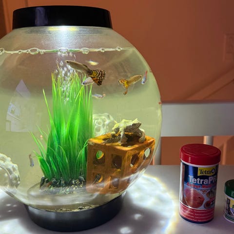 Mini akvarium med LED-lys, termometer og filter. Akvariet har fargerike grus og dekorative steiner. Egnet for små akvariefisk og akvariebruk.