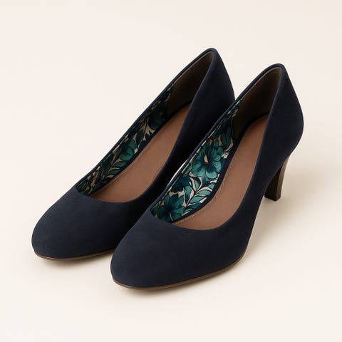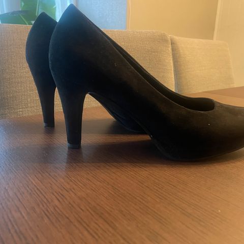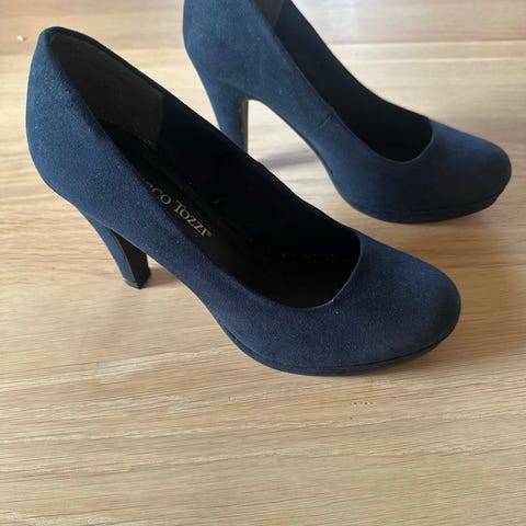 Elegante, semskede marineblå pumps i med blokkhæl fra Marco Tozzi. Disse skoene passer både til fest og til kontoret. Skoene er så å si ubrukt. Str 41.