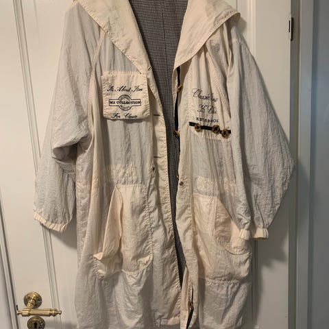 Fin jakke/kåpe. Kjøpt brukt på bruktbutikk i USA for mange år siden. Står ikke hvilket materiale det er i den, men vil gjette en ullblanding. Veldig pen i stoffet.