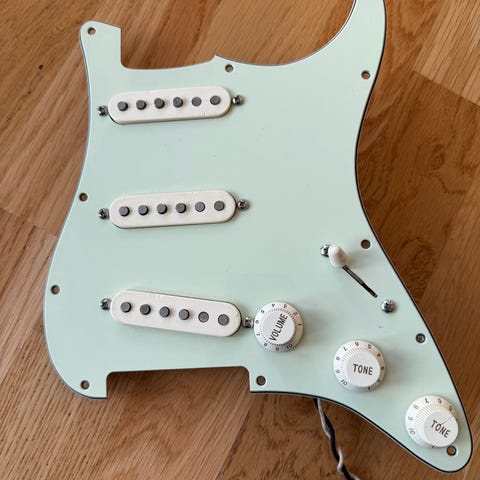 Selger en loaded pickguard fra Fender. Bare kvalitetskomponenter montert av Fender selv. Låter veldig bra og akkurat like spanky og krystallklart som man kan forvente. Var egentlig påtenkt et gitarprosjekt, men tiden strekker dessverre ikke til. Så her er det bare til å montere og spille i vei. Kommer med alt av monteringsskruer og en kvalitetsjack fra Fender.