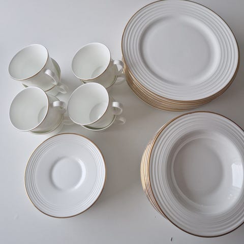 Hvite porselenstallerkener med elegant gullkant. Klassisk design, passer både til hverdag og selskap.