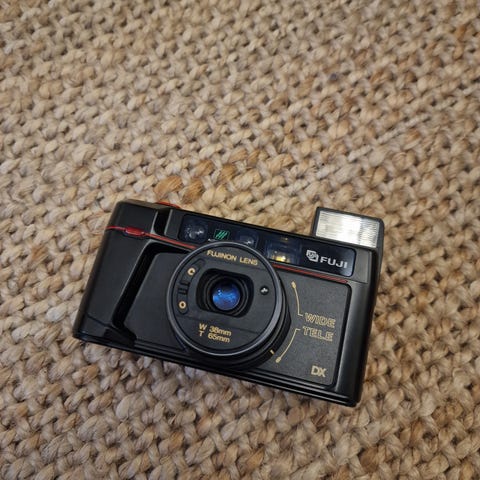 Selger et praktisk talt strøkent Minolta AF-Tele, et analogt kompaktkamera fra sent 80-/tidlig 90-tall som bruker vanlig 35mm film.