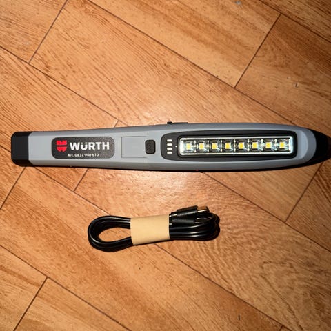 Undersøkelseslampe med bred stråle for inspeksjon av lakkoverflater og annet detaljarbeid. Drives av de vanligste 18-20 V verktøybatteriene. Justerbar lysstyrke og fargetemperatur, oppgitt maksimal lysstyrke på 3000 lm. Fargegjengivelsesindeks (CRI) opp til >96.