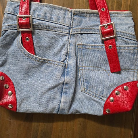 Bærekraftig Denim bag / skulderveske - sydd av jeans og gardinstoff til for. Hjemmesydd og ikke brukt. Har flere vesker til salg.