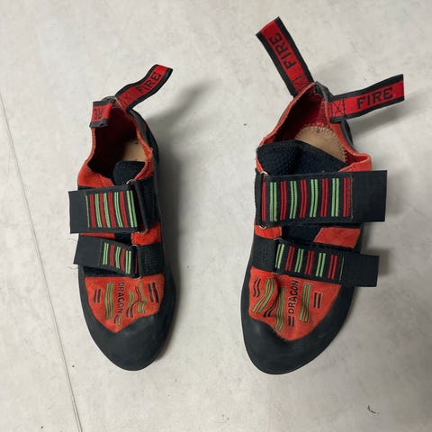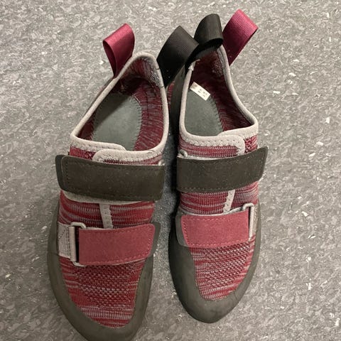 Skoene har borrelås for justerbar passform og en gummisåle for godt grep. Designet for klatring med fokus på funksjonalitet og komfort.