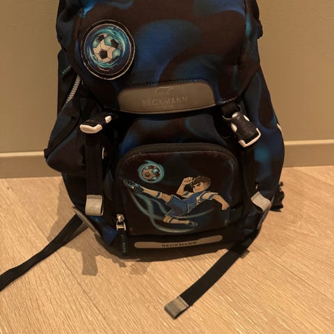 Skolesekk (1-3 klasse) fra Beckmann med ninjamotiv. 22 liter. Sekken er brukt og viser slitasje i stoffet flere steder, spesielt på lomme foran og magebetet. Den ene spenna til brystbelte er ødelagt. Ellers er spennene i orden. Følger med regntrekk.