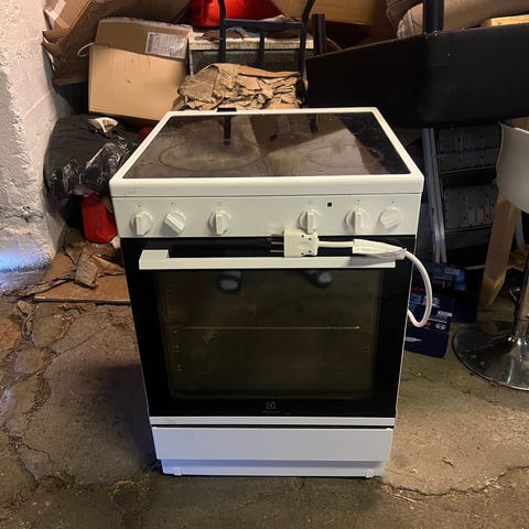Electrolux keramisk komfyr med fire kokeplater. Komfyren har et ovnsrom med flere rister og en hvit farge. Betjeningsknapper for temperatur og funksjoner er plassert på frontpanelet.