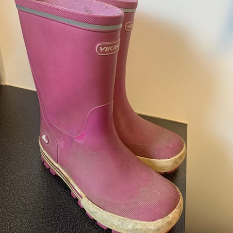 Viking Barne Gummistøvler unisex i størrelse 31. Støvlene er svarte og laget av gummi, egnet for bruk i vått vær og gjørmete forhold. Brukt av én jente i én sesong. De viser normale bruksmerker. De er veldig komfortable, datteren min likte dem veldig godt.