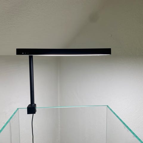 Fullspektrum LED-lys for akvarium, fantastisk fargegjengivelse. Denne versjonen har 6500 K (naturlig lys) og 20500 K (blått lys for saltvann). Nydelig design, app-styring (timer, ulik styrke til ulike tidspunkt, osv). Kan også kontrolleres direkte på lampa. Nypris ca 6.000 kr.