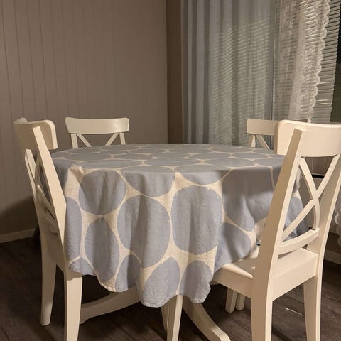 Selger bord fra IKEA og fire stoler, helst samlet. Må hentes :) Bordet er fra IKEA og heter Ingatorp. Kan legges ut med plater. Er godt brukt, men har mye god bruk igjen :)
