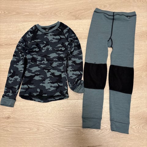 Helly Hansen Multisport 225g merinoull barneklær for gutt i størrelse 116. Settet består av en longsleeve og bukse i blå farge, laget for å gi ekstra varme under kalde forhold. Materialet er merinoull, som gir isolasjon og fukttransport.