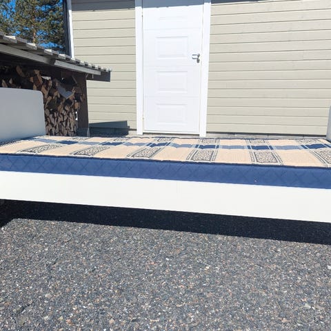 Grei stand, har blitt tepperenset. Har brukt overmadrass. Myk og komfortabel, dyr seng i sin tid. (ene siden er falmet pga sol, men har brukt en fin hengende laken som dekker rundt sann det ikke viste i det hele tatt)