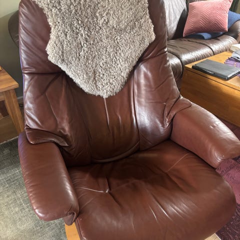Svart skinnstol med tilhørende puff. Bein i lyst tre.