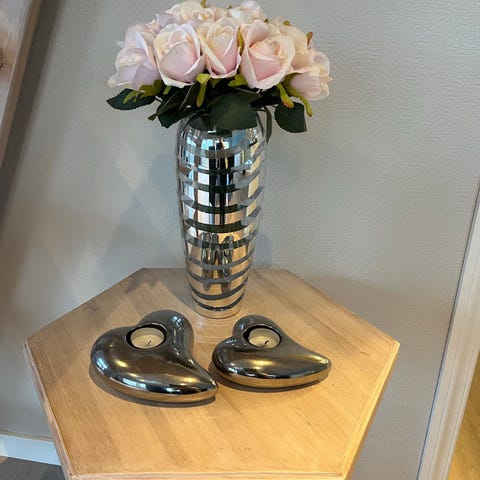 Hvit og sølv stor kähler omaggio vase selges da den bare har blitt stående i et skap. Ca. 30 cm høy