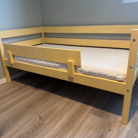 Madrass (BabyMatex Softi Plus Madrass 70x160 cm) og sengehest følger med.