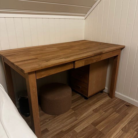 Skrivebord fra Jysk. Fungerer utmerket og kan flatpakkes for frakt. Selges grunnet flytting. Må hentes. Mål 60x120 cm.