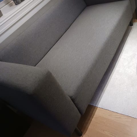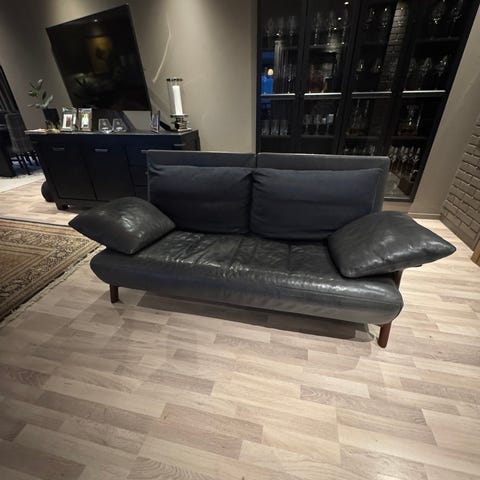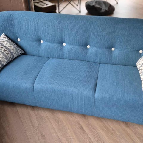 Eldre sofagruppe selges. Sofa og stoler selges kun samlet og må hentes. Møblene ble trekt om i en fin blåfarge for en del år siden. Det er bruksmerker , men møblene fremstår i god stand. Selges grunnet flytting og plassmangel. Mål sofa ca.: h:75, d: 83, b: 145. Mål stol ca: h:75, d:83, b:64.