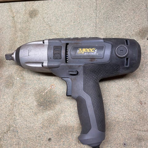 Meca pneumatisk muttertrekker med tilkoblet luftslange. Verktøyet er laget for bruk med trykkluft og har et ergonomisk grep. Passer til oppgaver som krever høyt dreiemoment for å løsne eller stramme muttere og bolter.