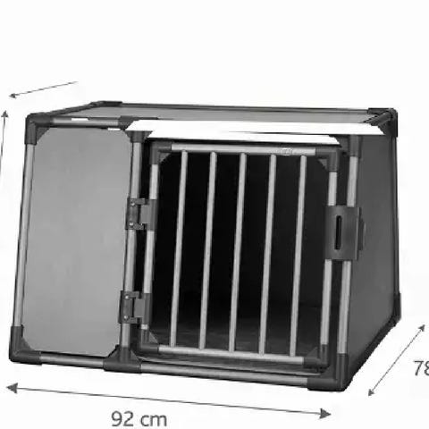 Designet for sikker transport eller oppbevaring av hunder. Robust konstruksjon med gitterpaneler for ventilasjon og oversikt.