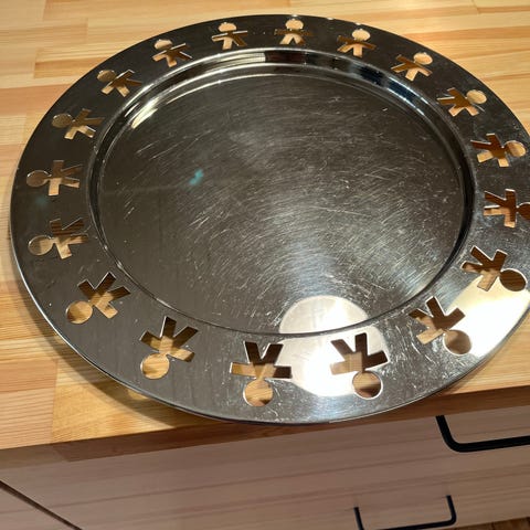 Dette er et rundt Alessi Girotondo serveringsfat i blankt, rustfritt stål, designet av King-Kong-teamet Stefano Giovannoni og Guido Venturini.