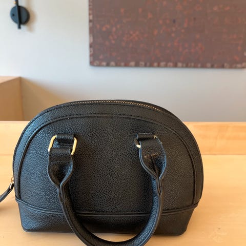 Zara dameveske laget av kunstlær. Vesken har to håndtak og en avtagbar skulderrem. Den lukkes med glidelås og har flere rom for oppbevaring. Fargen er blå-grågrønn.