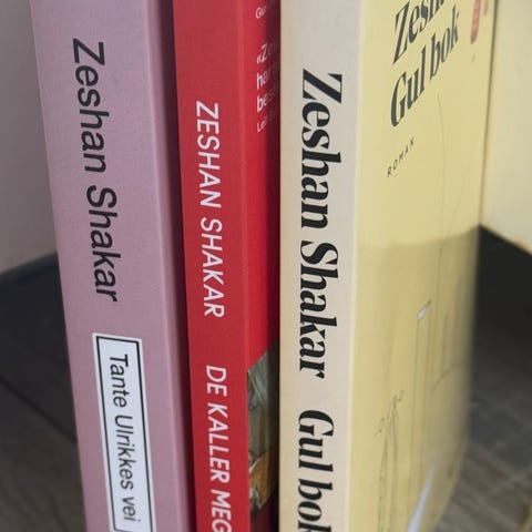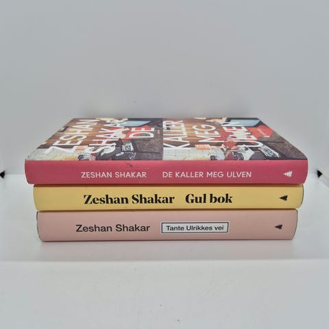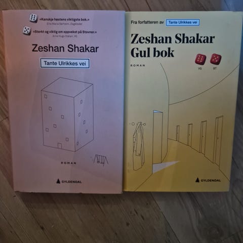 Selger to bøker av Zeshan Shakar. Det er "Gul bok" og "Tanta Ulrikkes vei". To bøker av forfatteren Zeshan Shakar, utgitt av Aschehoug. De er som nye, ikke synlig brukt og selges samlet for 250kr