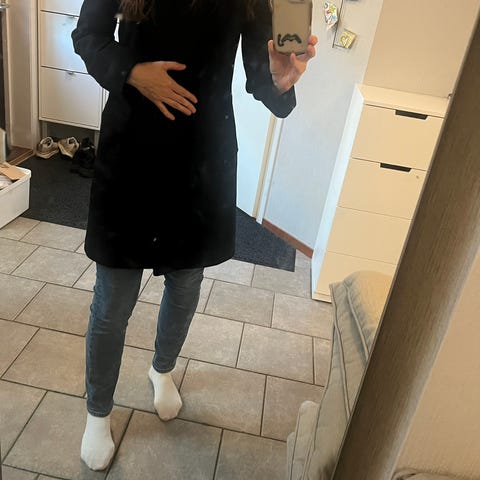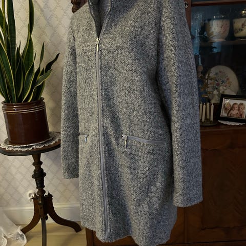 Kåpe i str 40 fra Ellos. Pent brukt. Imitert skinn ved lommer og langs glidelås. Ellers 12% ull og polyester.