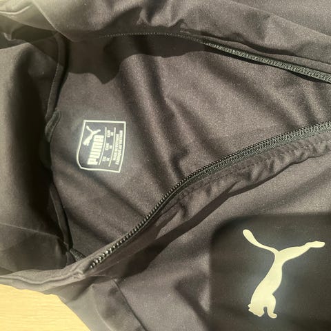 Puma fotballbukse i størrelse S. Buksen er svart og laget for fotballbruk, med elastisk midje og glidelås nederst på bena for justerbar passform.
