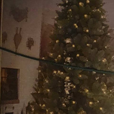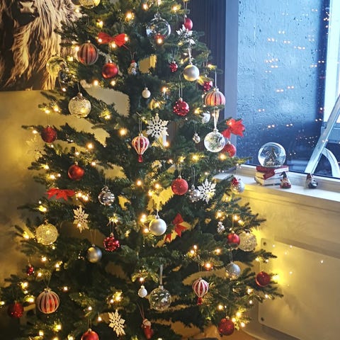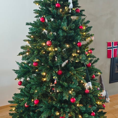 Kunstig juletre 210 cm høyt og 300 fastmonterte led lys.