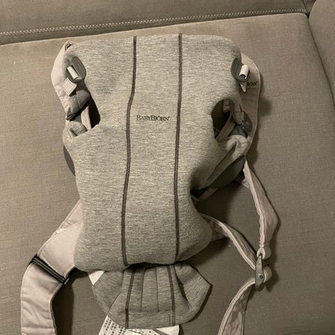 BabyBjörn Mini bæresele i beige. Bæreselen er designet for å gi god støtte og komfort ved bæring av barn. Den har justerbare stropper og spenner for tilpasning til brukerens kropp. Egnet for både forovervendt og innvendt bæring.