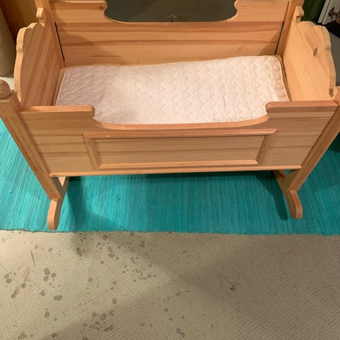 Vugge laget av rotting og stoff med et stativ i tre. Vuggen har en oval form med håndtak i rotting på sidene. Fargen er naturlig beige/hvit. Passer til bruk for spedbarn.