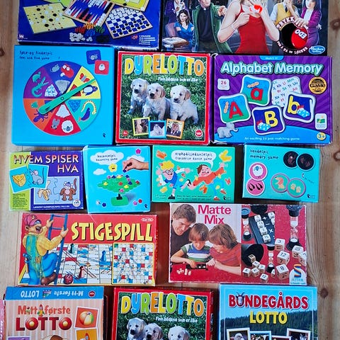 Selger en pakke med brettspill. De fleste er tilnærmet ubrukt og beregnet til barn. Kaptein Sabeltann er gammelt og godt brukt. Selges helst samlet.