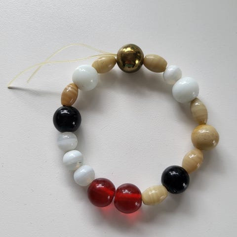 Kult bohemsk Popin armbånd laget med store og små perler i gul/grønn og brun/rød farge. Perlene er i stein eller glass, usikker på materialet. Armbåndet er tungt, lukkingen er en perle som festes i en løkke. Ca 20 cm i omkrets. Unisex.