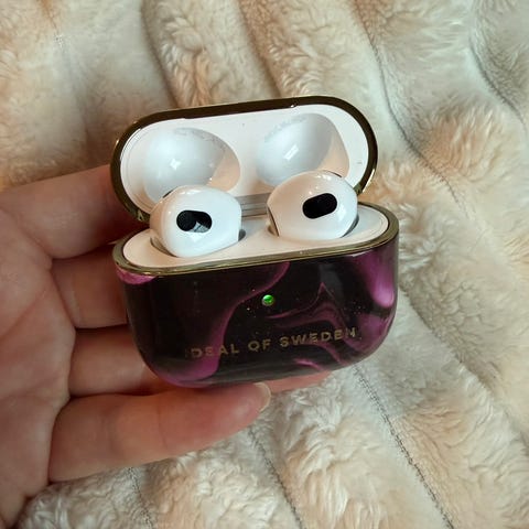Selger dette pent og lite brukte Apple Gen 3 Airpods, Kjøpt i London Covent Garden apple butikk. Venstre Øreplugg er ikke med!! Kunn Høyre og ladeetui og orginal boks som avbildet. Klomsete som jeg er så har jeg mistet endel par over årene og kjøpt nye på nye, sitter igjen med dette parret nå som jeg ikke bruker som jeg fant igjen. Selges derfor til en fin pris.