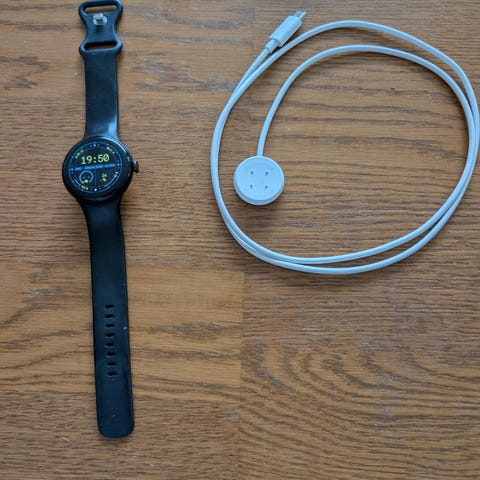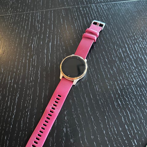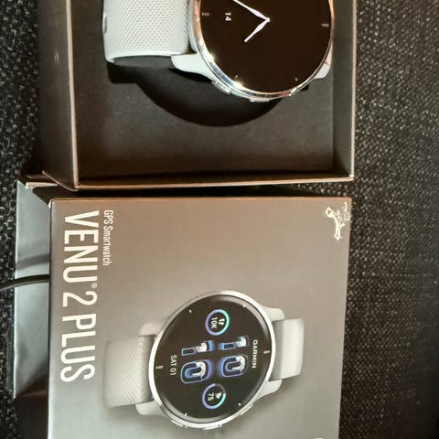 Kjøpt i 2022. Veldig bra klokke med god batteritid - opptil 10 dager. Litt småriper på skjerm, men dette er ikke synlig når klokkeskjermen er i bruk. Silikonfesteringen på klokkereimen er ødelagt (derfor er det på en svart stopper), så trenger nok en ny reim. Lader følger med.