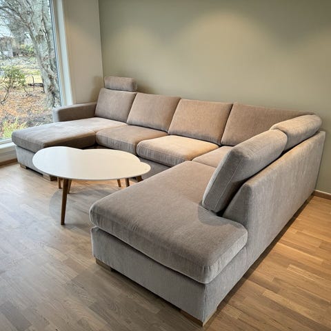 Høyra oppsett, fint og lite brukt (ca 2 år). Modern sofa i mørke grønn farge.