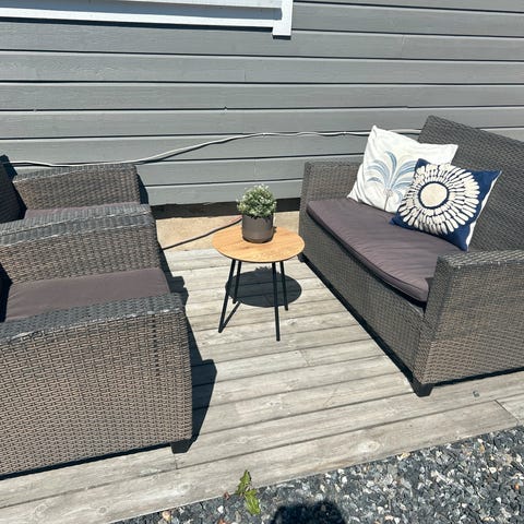Pent brukt kafésett med bord og to stoler. Sammenleggbart og plassbesparende – passer perfekt til balkong eller terrasse. Klar for henting. Pris kan diskuteres ved seriøs interesse.