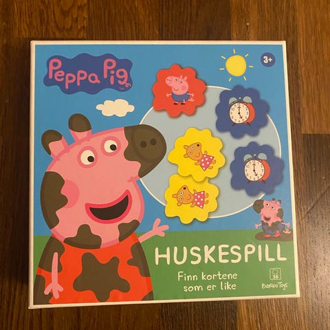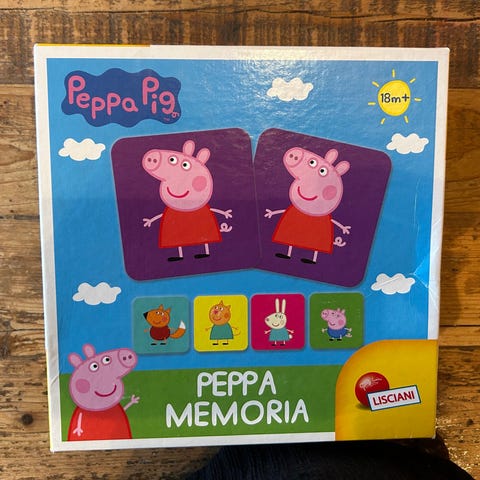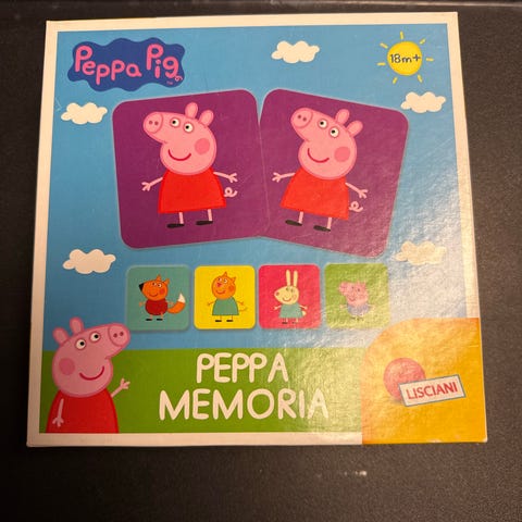Peppa Gris memo spill med fargerike brikker som inkluderer karakterer og elementer fra Peppa Gris. Pemt brukt uten synlige anmerkninger.