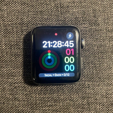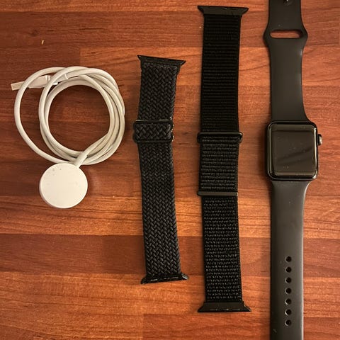 Apple Watch Series 3 smartklokke med svart urkasse og svart sportsarmbånd.