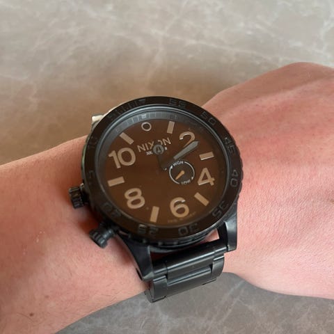 Lite brukt Nixon 51-30 klokke som har blå urskive med mange detaljer som sølvfargede tall og markeringer, blanke og blå visere, tøff Nixon logo, lume på visere, datovisning.