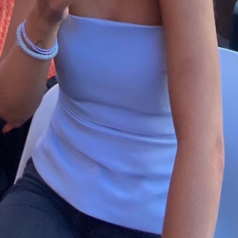Størrelse S, merkelappen henger fremdeles på. Farge på underdelen er mørk blå. Knyting i midjen og justerbare stropper. Sitter veldig fint på.