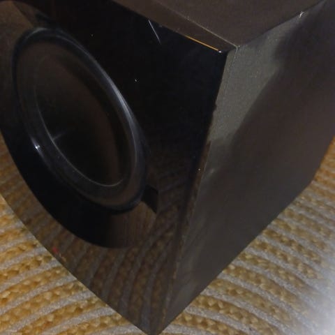 Logitech høyttalersystem bestående av to satellitthøyttalere og en subwoofer. Svart farge med rund bassport på subwooferen. Egnet for bruk med datamaskin eller annet lydutstyr.