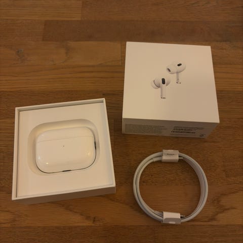 Selger AirPods etui, modell AirPods Pro (Gen. 2). Har en øreplugg som kan kjøpes for 559-, ekstra. Selges fordi jeg mistet høyre øreplugg. Jeg har digital kvittering og boks.