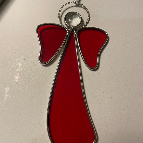 Hadeland Glassverk engel dekorasjon laget av rød og klar glass. Passer som juledekorasjon i desember.