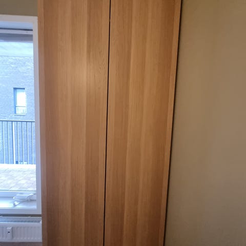 Selger ubrukt pax Garderobeskapstamme + 2 stk dører, da vi ikke fikk bruk for det. Er demontert igjen, men skruer og plugger står i klart for raskt montering igjen. Er heis i bygget og bil kan kjøres til inngangsdøra.