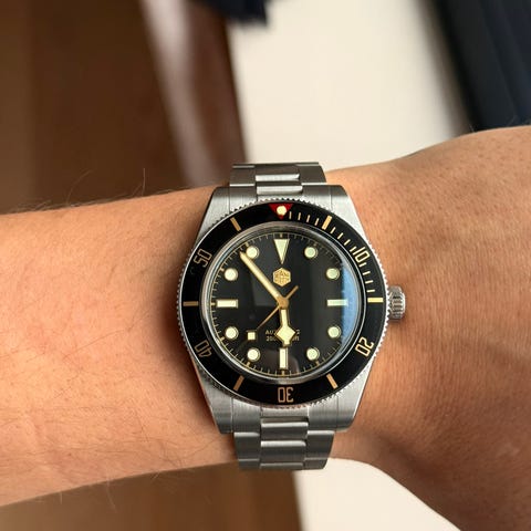 Kjøpt i 2023. Pent brukt, men det finnes bruksmerker. Se bilder. Selges komplett med papirer, boks, ekstra ledd og ekstra silikonreim i sort.