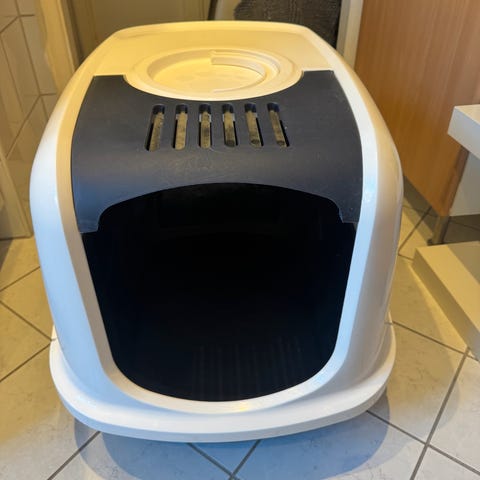 Kattedoen har høye kanter som forhindrer sand og urin på gulvet, og et avtakbart topplokk som gjør rengjøring enkelt.