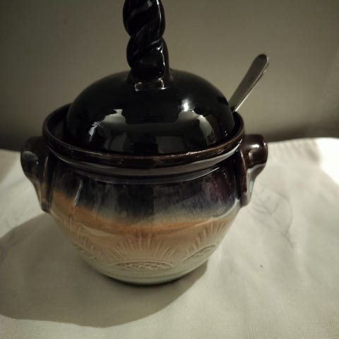 Fin liten krukke i grønn glasert keramikk, perfekt til sukker, småting eller som dekor. Tidløs og rolig farge 💚