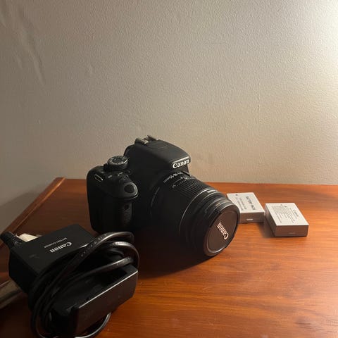Canon EOS 600D kamerahus 18 megapiksler for bilder og videoer med batteri og lader +Canon objektiv EF-S 18-55 IS image stabilizer- Macro + Minnekort 32GB +USB kabeler + Kameraveske +Kameradeksel og Kameraveske. du ser på bildene. Salges samlet for 1850kr. De er I veldig god stand.